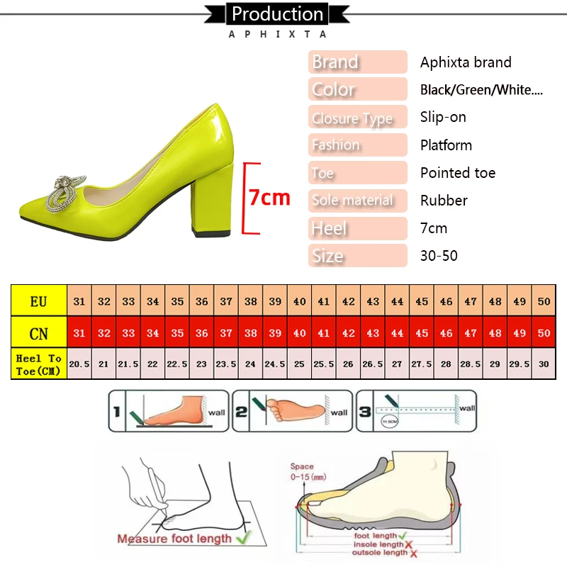 Aphixta Green Bling Crystals Bowknot Flowers 7cm Square Heels Pumps Women Shoes Students & Adults Pointed Toe Plus Size 30-50
